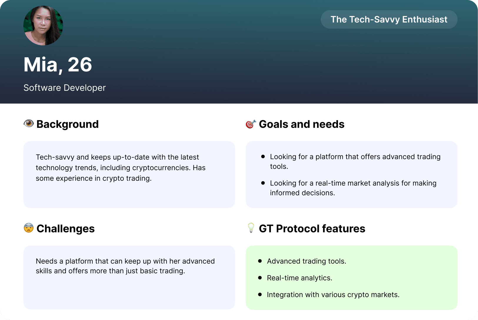 In the User Research phase, I analyzed data from existing crypto platforms to understand user interaction patterns, popular features, and common usability issues. This analysis led to the creation of detailed user personas, each representing different user segments.