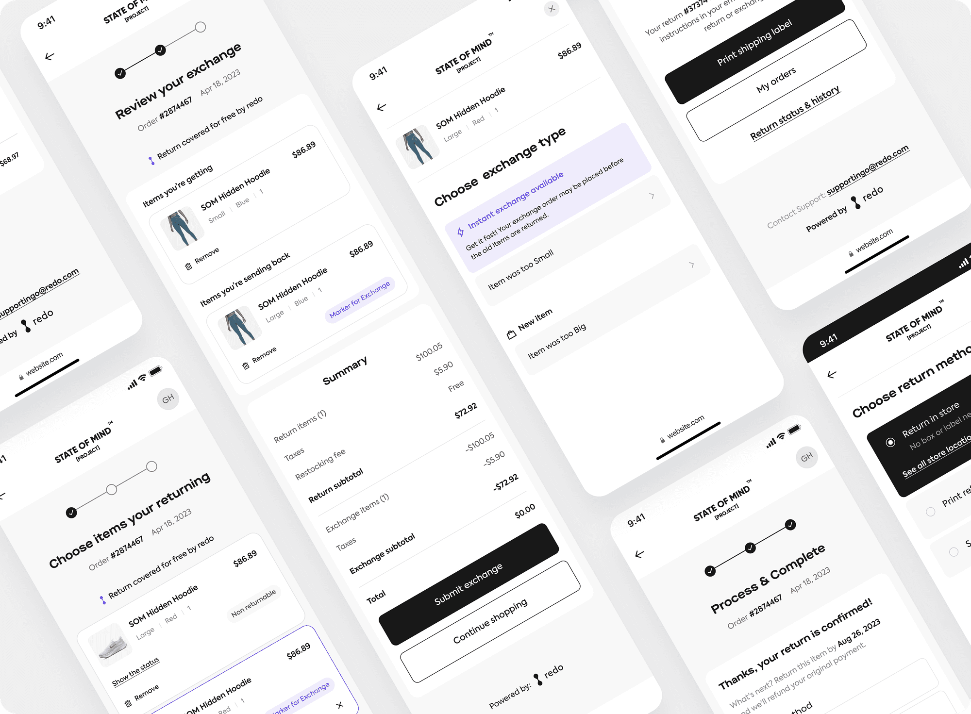 The mobile adaptation of the "Process & Complete" stage was enhanced by incorporating new features, including multiple Return Methods (such as In-Store Returns and Print Return Label), various Refund Method options, and a detailed Overview section, ensuring a seamless and efficient user experience across mobile devices.